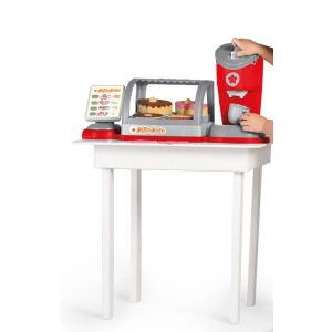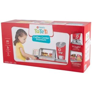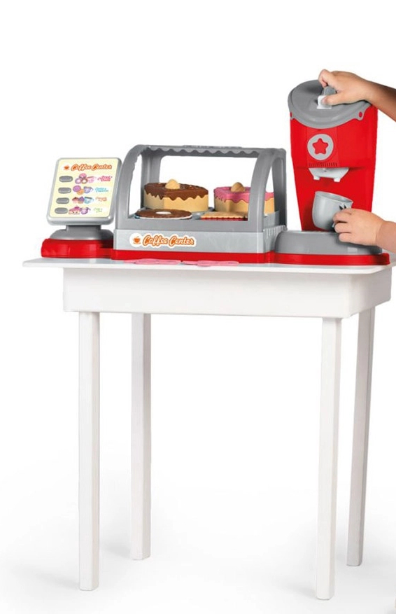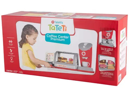 É uma cafeteria completa, vem com uma estufa recheada de docinhos e duas xícaras, e um painel que gira 360° para brincar de comprar e vender.