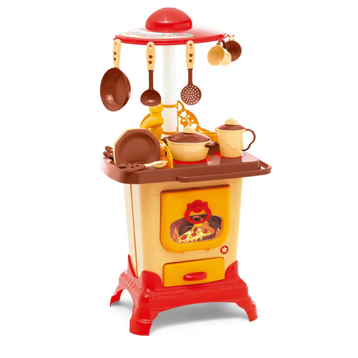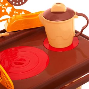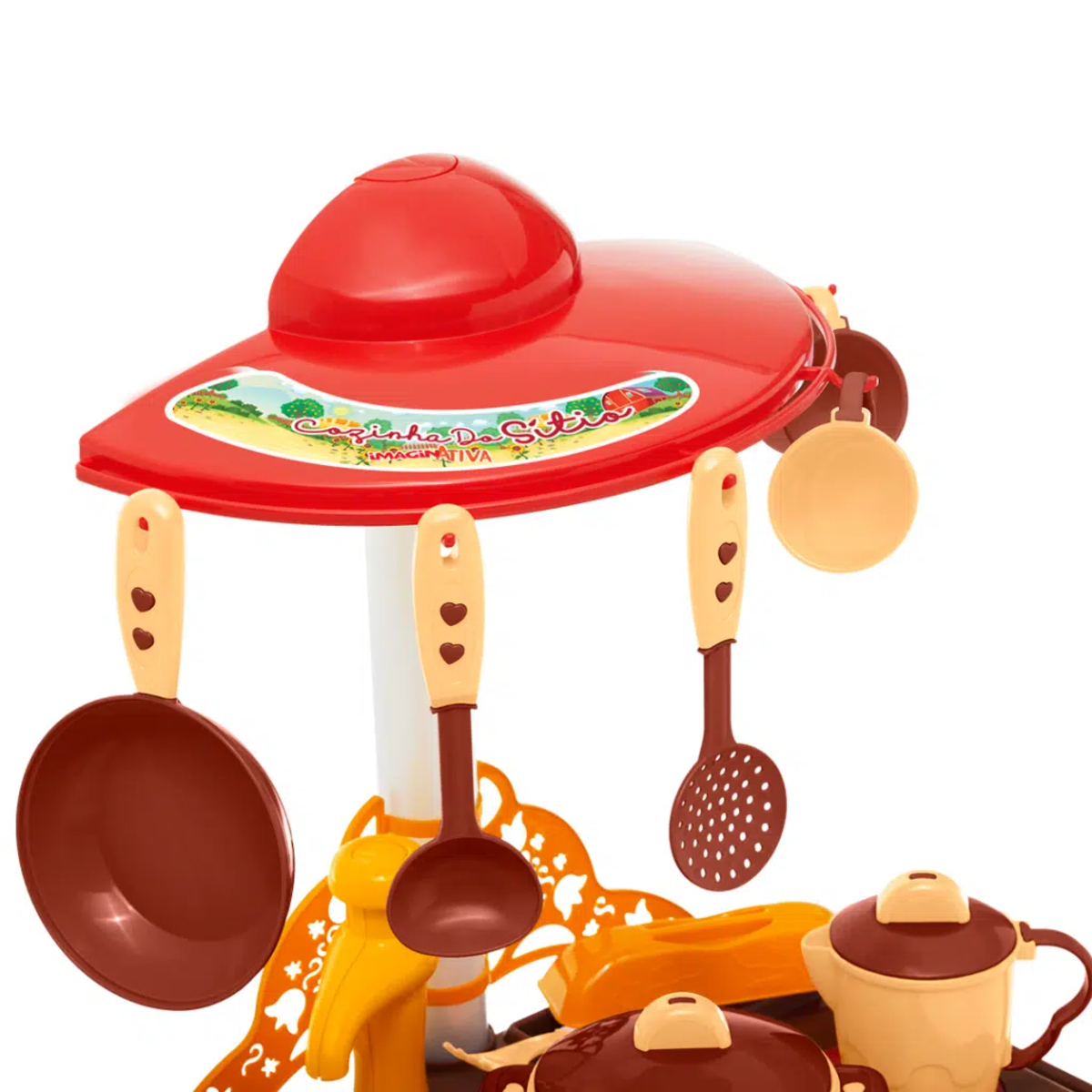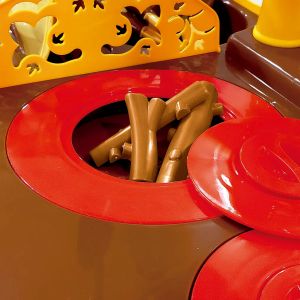 Estilosa e funcional a cozinha do sítio estimula a criatividade das crianças através do faz de conta. A graça da cozinha fica por conta do fogão superior com peças de encaixe, como em um fogão a lenha de verdade! E, para enriquecer ainda mais a brincadeira, o fogão possui um suporte para pendurar o pano de louça na borda, e a coifa é multiuso, nela é possível pendurar os utensílios da cozinha. Além das cores atemporais que lembram uma cozinha de sítio, ela acompanha vários acessórios, como pratos, xícaras, talheres, panela e leiteira com tampa. Também possui pia com torneira que sai água de verdade, conta ainda com mais um forno na parte inferior, com gaveta.