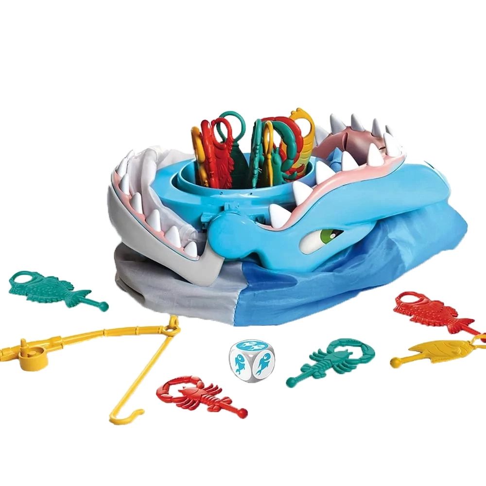 Resgate as presas dessa fera voraz, mas tome cuidado para ele não te pegar. Jogue os dados para saber quantos peixes você precisa pegar. Tire os peixes da boca do tubarão com sua vara de pescar. Quem pegar mais peixes, ganha. Se o tubarão te pegar, você perde tudo.