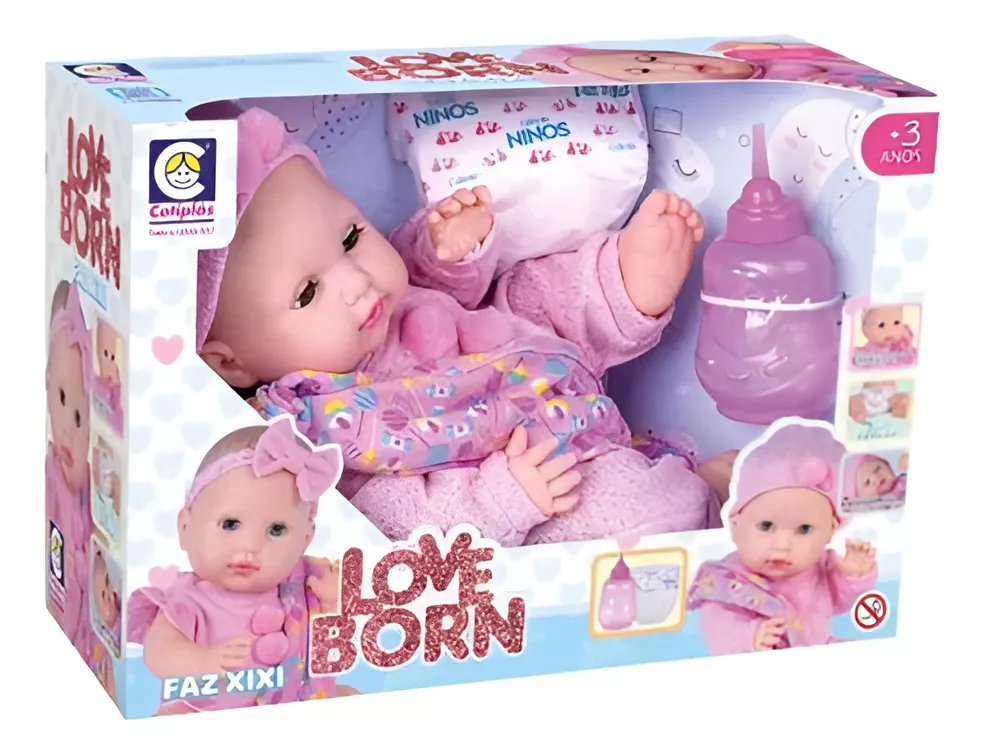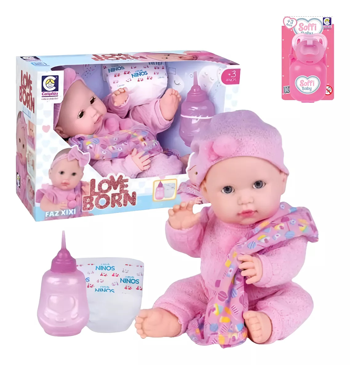 Contém: 1 boneca, 1 fralda e 1 mamadeira.
