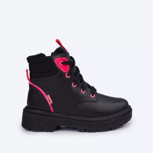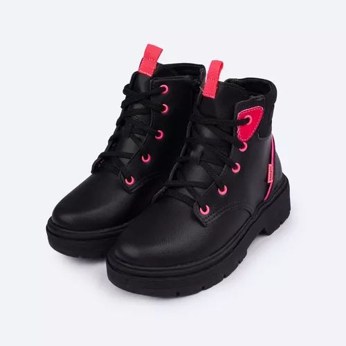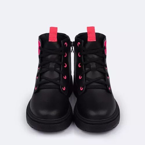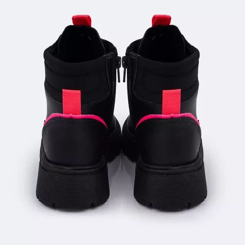 Bota coturno feminina em sintético preto e detalhes pink flúor, muito moderna e confortável para todos os momentos! Coturno infantil forrado em tecido que auxilia na absorção do suor. Palmilha Feet Care que possui um sistema avançado de fofura, com a densidade ideal para os pés, minimizando impactos. Fechamento em zíper na lateral e cadarço, acomodando o calçado infantil ao pé. Solado tratorado em micro expandido, material leve com muita aderência e estabilidade, além da flexibilidade, resistência térmica e alto desempenho antiderrapante.