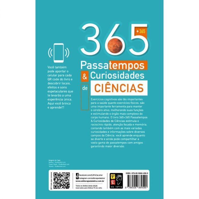 Exercícios cognitivos são tão importantes para a saúde quanto exercícios físicos, são uma importante ferramenta para manter o cérebro ativo, melhorando suas funções e estimulando o órgão mais complexo do corpo humano. Nesse livro você encontra curiosidades incríveis sobre diversos campos da ciência através de diversas atividades, como caça palavras, sudoku, palavras cruzadas e muito mais, além disso encontro no qr code disponível uma viagem única por lugares incríveis com sons e imagens fantásticas.